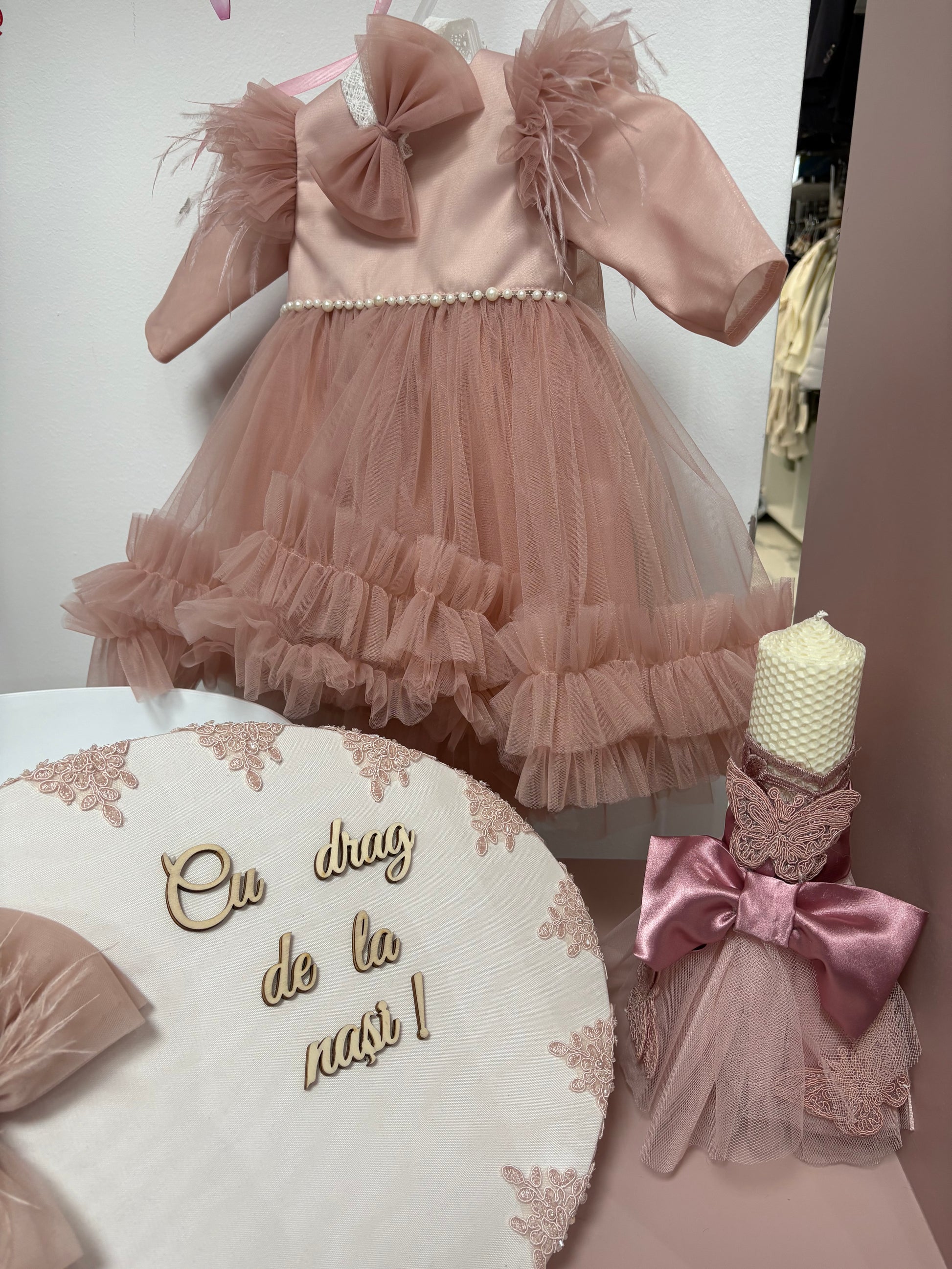 Set complet botez fetiță – rochiță roz prăfuit cu trusou și lumânare asortată